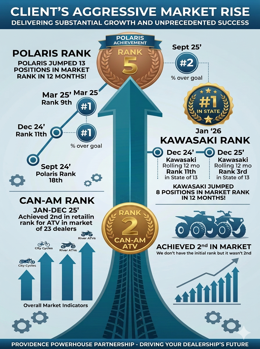 The dealer owner was not only new to the powersports industry but purchased a low performing store location. We needed to create a strategy that would quickly turn the dealership around by increasing sales volume and profitability.